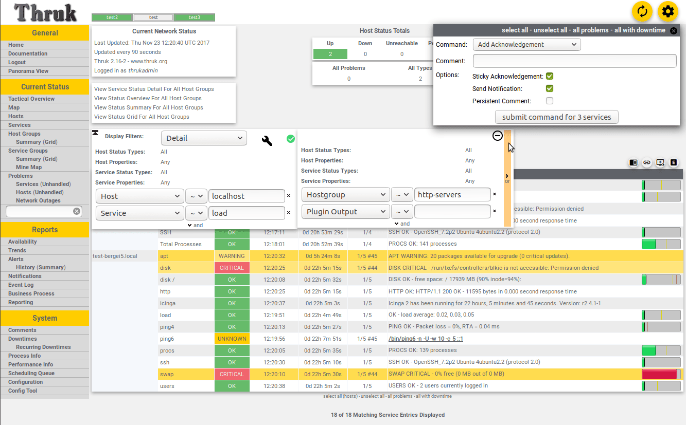 Thruk has many great features, but the first thing you notice is the speed.Even a configuration with thousands of hosts and tens of thousands of serviceshas sub second response times for service listings and search results. But the killer feature of Thruk is arguably it’s multi back end support. Sayyou have a old legacy Nagios installation still in production in addition to anew Naemon or Icinga 2 server. With Thruk you can configure both of these asbackends for Thruk, and it will give you one unified view to all hosts andservices configured. One less tab in your browser.