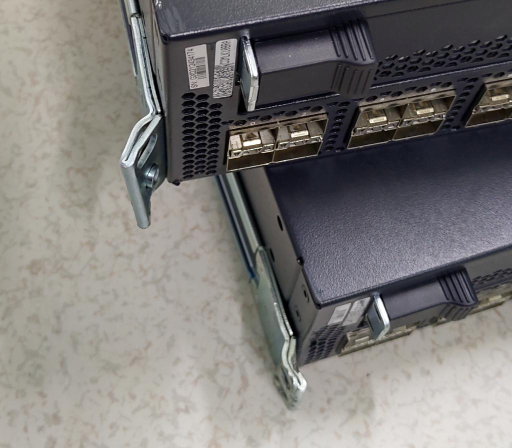 The process clearly took its toll on the rack mount brackets. They could probably be bent back to working order, though. I also dented the chassis of one of the switches a bit.